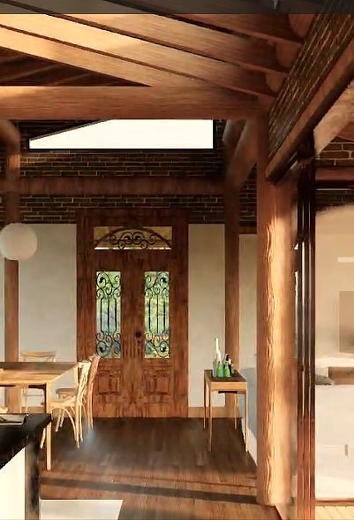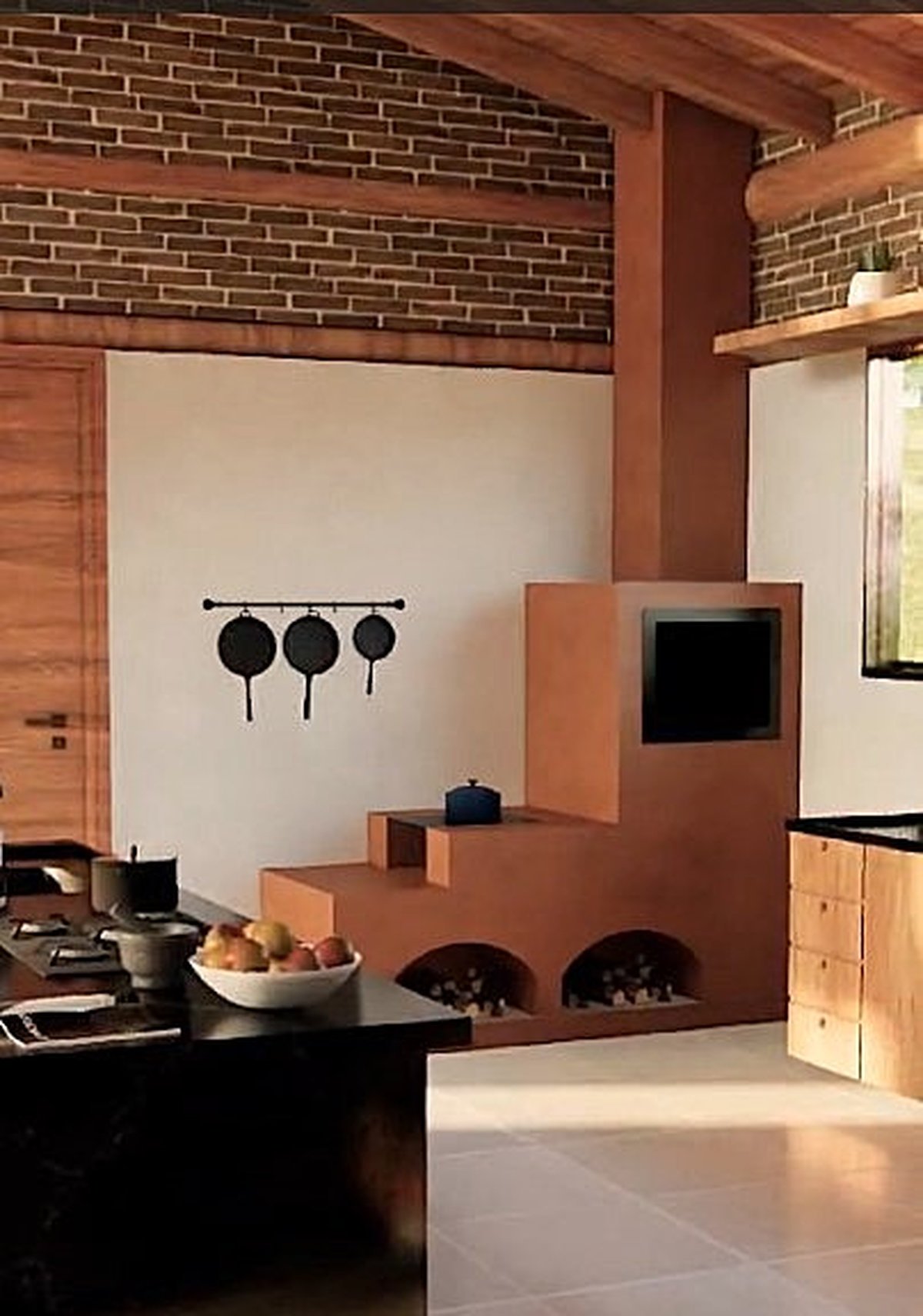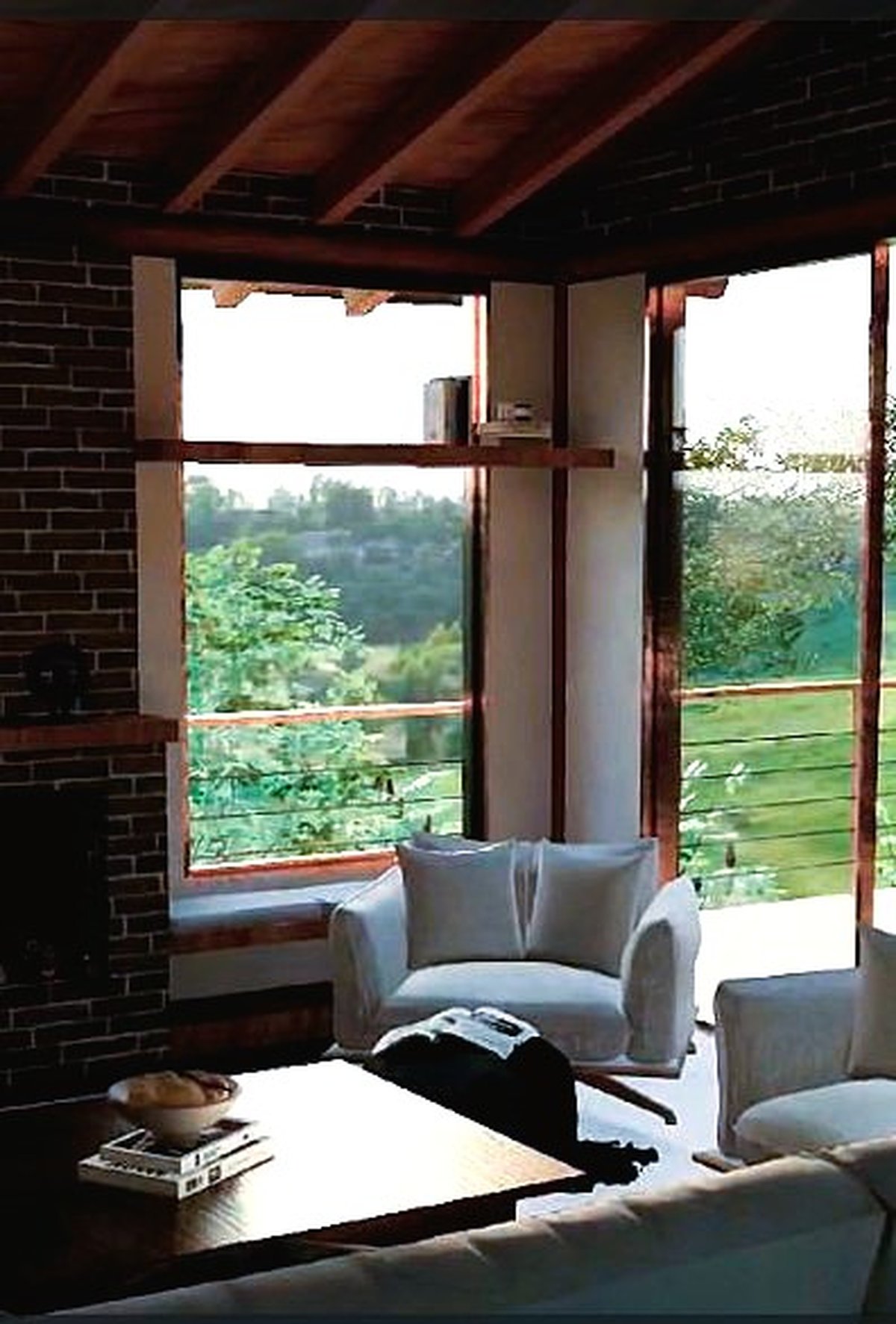Sua estrutura combina pilares e vigas de eucalipto tratado com fechamentos em tijolo cerâmico e detalhes em tijolinho maciço, que acrescentam charme e aconchego. Implantada em terreno em aclive, pousa suavemente sobre o relevo, destacando um deck central de madeira com vista espetacular para o vale e as montanhas.