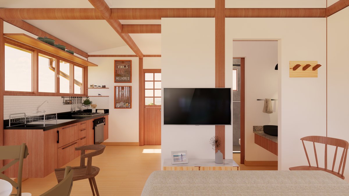 Na cozinha, o design contemporâneo se traduz em equipamentos modernos, materiais resistentes e de fácil manutenção, unindo praticidade ao prazer de cozinhar. O aconchego da madeira está presente em cada detalhe: na estrutura aparente, nas esquadrias, nos armários e até nas prateleiras, reforçando o diálogo entre natureza e conforto.