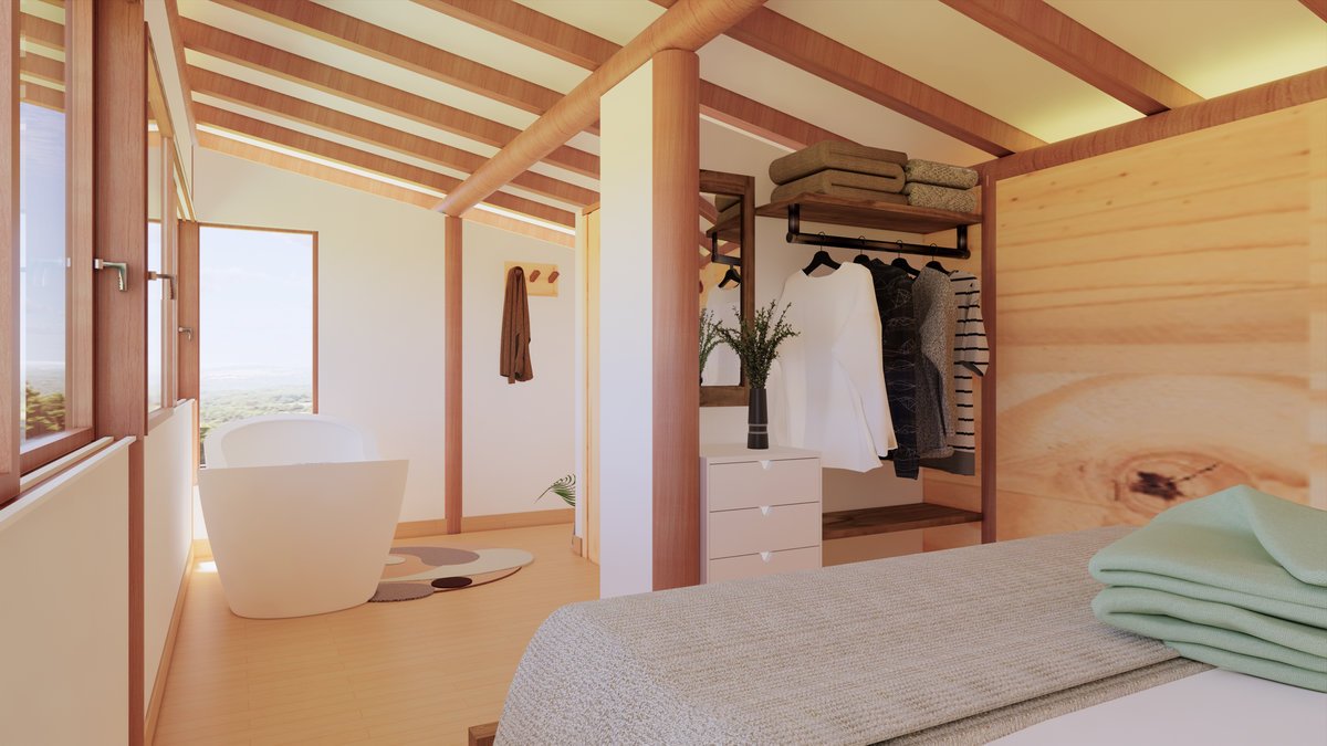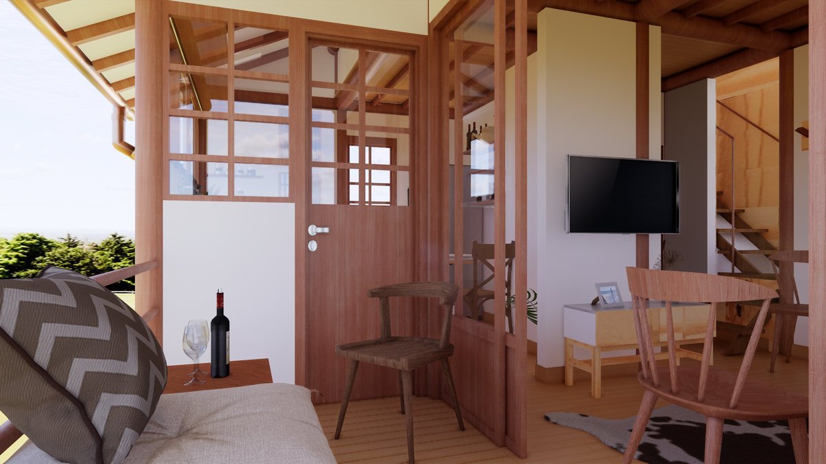 Projetada especialmente para regiões de clima frio e terrenos de topografia inclinada, ela se acomoda à paisagem de forma harmoniosa, oferecendo charme e funcionalidade. O acesso pode ser feito tanto pela varanda quanto pela suíte, criando uma experiência de entrada acolhedora e prática.
